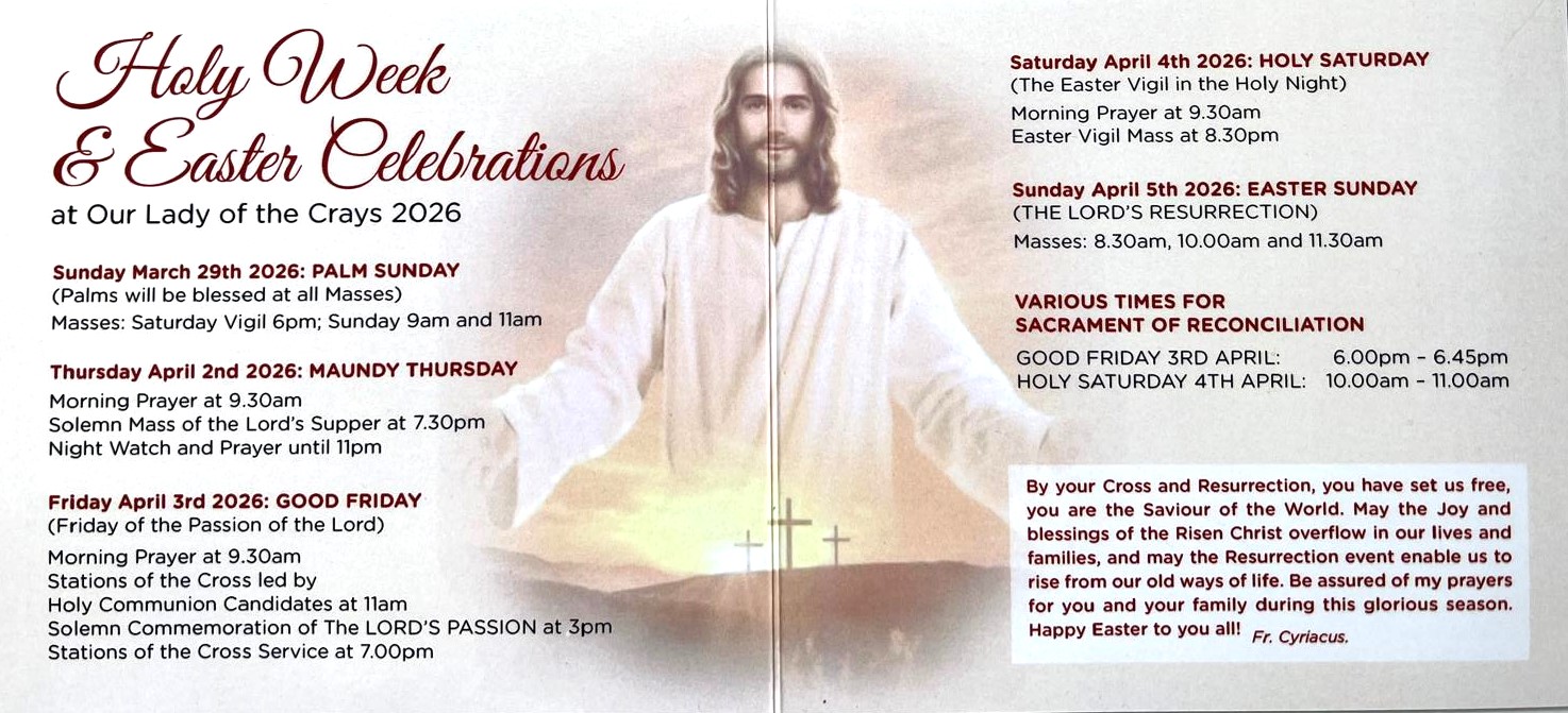 As the Parish Priest of Our Lady of the Crays, Cray Valley, may I offer you a very warm welcome to our Parish family. I hope you find Our Lady of the Crays to be a great place to worship God in the liturgy and great support to your faith.